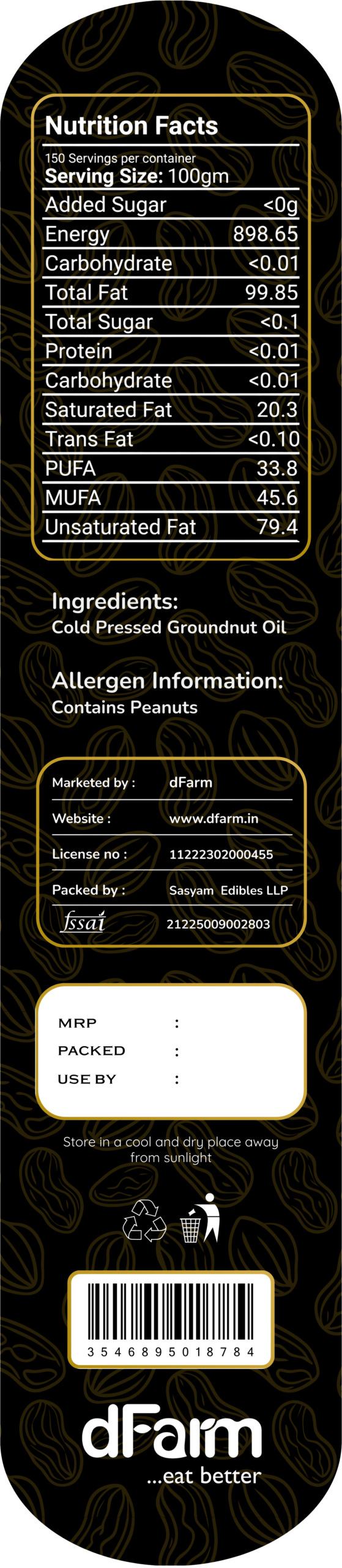 dFarm Groundnut Oil Premium | 100% Cold Pressed Groundnut Oil | Unrefined, 0 trans fat, Chemical free | Helps Lower Cholesterol, Goodness of Omega 6 & Authentic Seed Flavour | 1L Pet Bottle